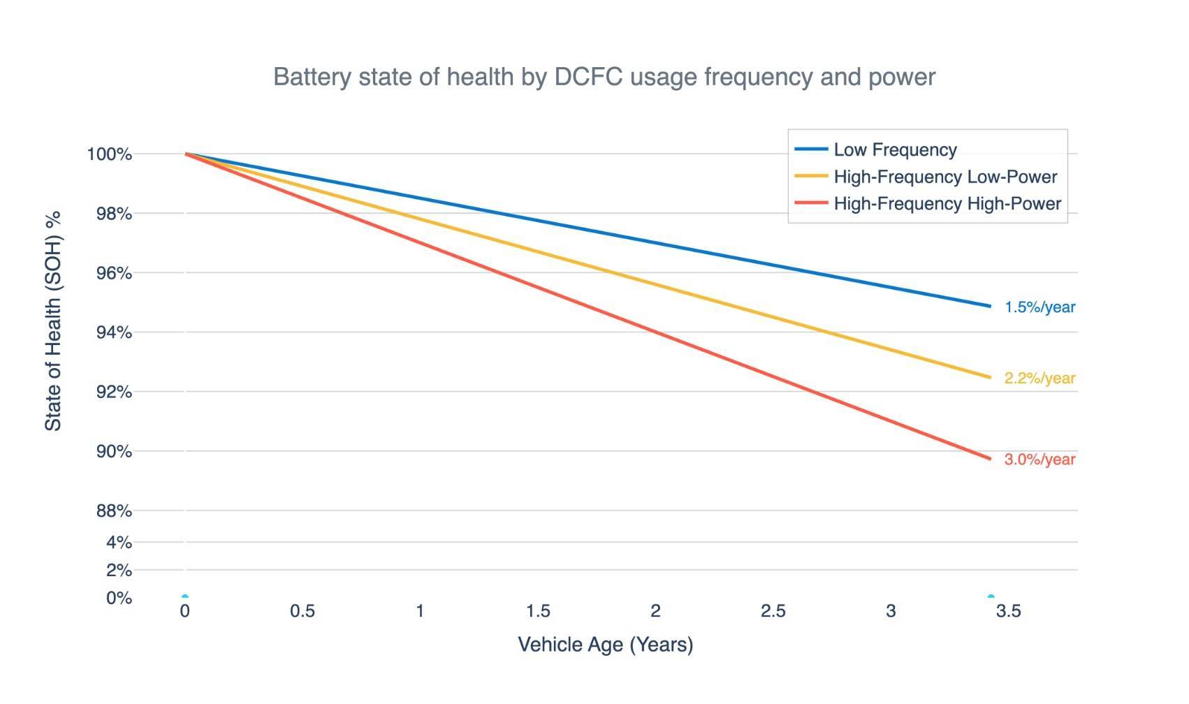 频繁大功率快充(超过 40% 的充电发生在 100 kW 以上):年均衰减约 3.0%,8 年后仅约 76%。