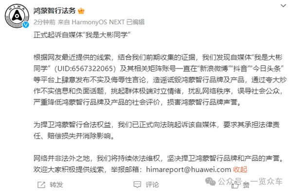 就鸿蒙智行起诉自媒体“我是大彬同学”一案